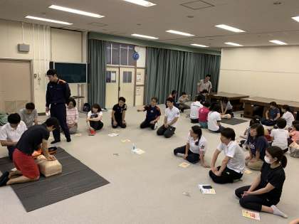 プール水泳や海水浴の季節を控え、救命講習会を開催しました。浪速消防署の方から心肺蘇生法や、AED(自動体外式除細動器)の使用方法について、教えていただきました。