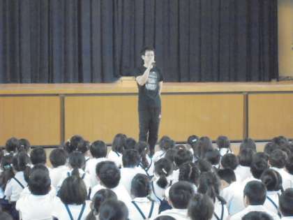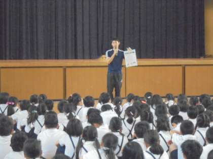 (下)生活指導部長の高嶋先生から、遊具のかたづけ方のお話です。