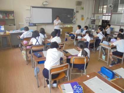 (上)図書室で、本の貸し出しをしています。ありがとう!