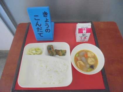 ちくわのいそべあげ、鶏肉と一口がんもの煮もの、あっさりキャベツ、ごはん、牛乳です。