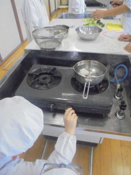(上・中)野菜サラダとドレッシングを作っています。コンロに火をつけたり、ブロッコリーを切ったりしています。