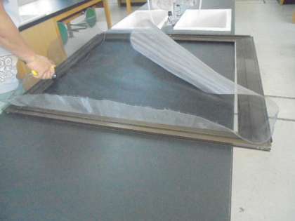 管理作業員の小林さんが、給食室の網戸を修理してくださっています。いつもありがとうございます。