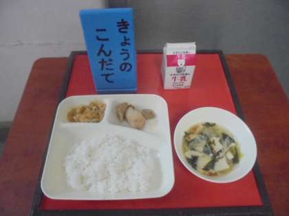 今日の献立は、鶏肉のしょうゆバター焼き、五目汁、切干し大根のいため煮、ごはん、牛乳です。