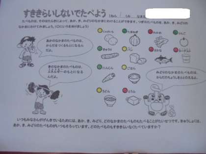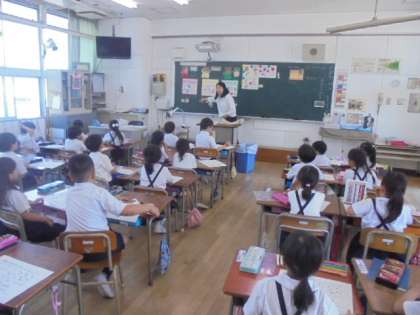 栄小学校の栄養教諭 大浦 美咲先生が、1年生に栄養指導をしてくださっています。今後、すべての学級で指導をしていただきます。