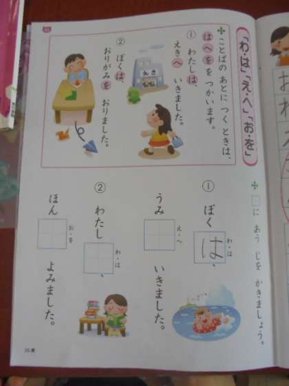 (上)「わ・は」「え・へ」「お・を」の使い分けを学習します。