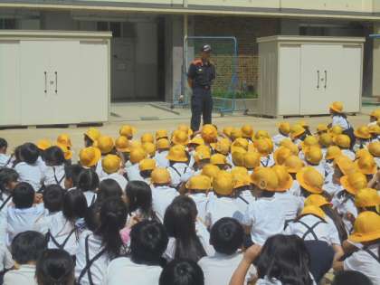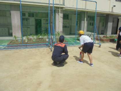 2時限目に火災を想定した避難訓練を行いました。どの子どもも、静かに素早く避難ができました。浪速消防署立葉出張所からお越しくださった消防署員の皆さんにも、ほめていただきました。水消火器を使った消火訓練もさせていただきました。