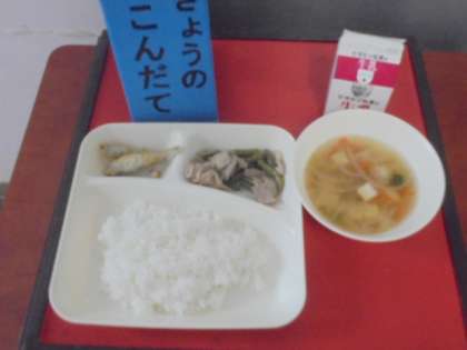 いわしてんぷら、すまし汁、豚肉とさんどまめのいためもの、ごはん、牛乳です。