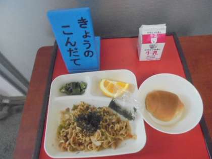 焼きそば、オクラのかつお梅風味、オレンジ、パン、牛乳です。