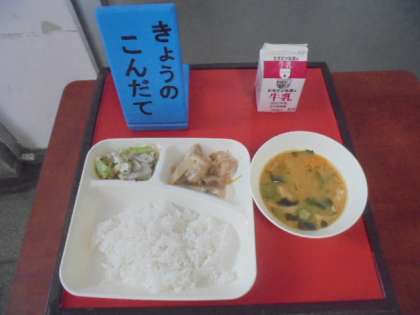 鶏肉の甘辛焼き、みそ汁、キャベツの赤じそあえ、ごはん、牛乳です。