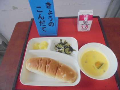 かぼちゃのクリームシチュー、ミックス海草のサラダ、りんご(かんづめ)、パン、牛乳です。