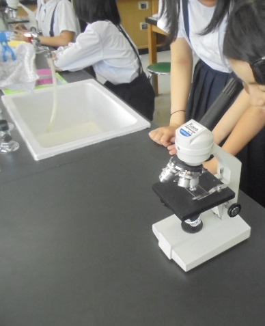 (下)植物の光合成でできたでんぷんを観察しています。