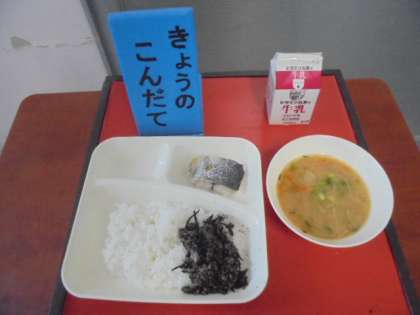 さごしの塩焼き、みそ汁、牛ひじきそぼろ、ごはん、牛乳です。