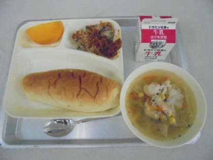 今日の献立は、かぼちゃのミートグラタン、スープ、オレンジ、パン、牛乳です。