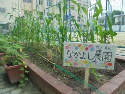 自作の立て看板です。オクラやピーマン、トウモロコシなどが見事に育っています。