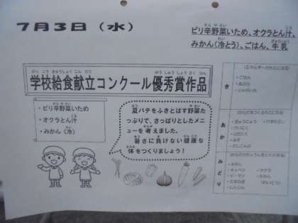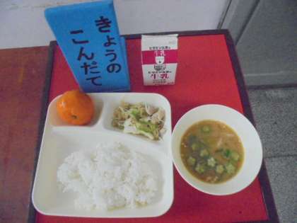 献立コンクール優秀賞作品です。ピリ辛野菜いため、オクラとん汁、みかん(冷とう)、ごはん、牛乳です。