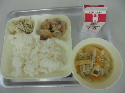 鶏肉のしょうゆマヨネーズ焼き、五目汁、切干しだいこんのゆずの香あえ、ごはん、牛乳です。