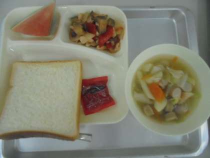 今日の献立は、鶏肉と夏野菜のソテー、押麦のスープ、すいか、パン、牛乳です。