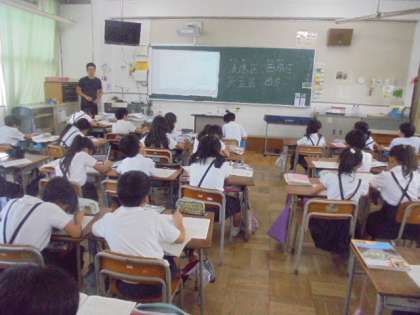 社会科の授業です。子どもたちにわかりやすく教えています。