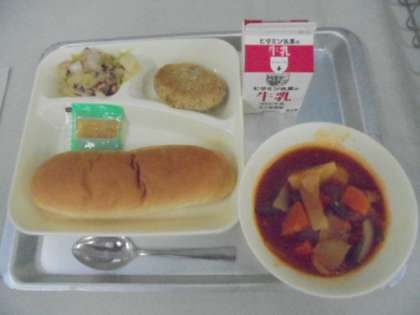 チキンレバーカツ、ケチャップ煮、たことキャベツのソテー、パン、牛乳です。明日が、1学期最後の給食です。