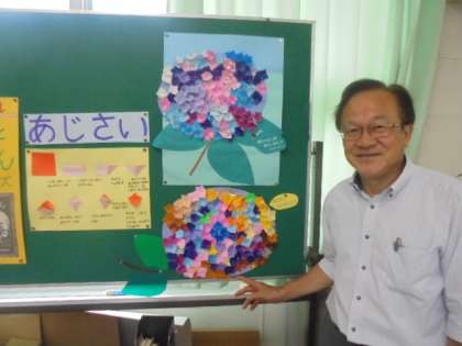 学校図書館補助員の小前先生です。子どもたちが、あじさいの花を咲かせています。