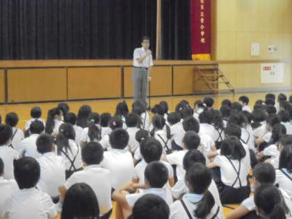 1学期の終業式です。人権教育・同和教育主担の谷山先生から、8月6日(火)人権・平和登校日のお知らせです。