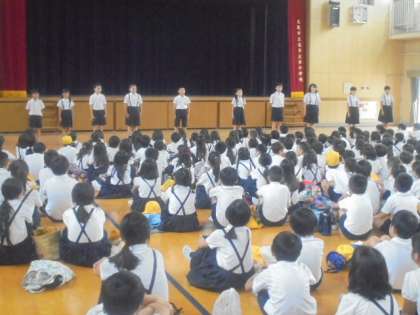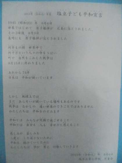 児童会の子どもたちの「塩草立葉小学校 平和宣言」です。心に響く、とても素晴らしいメッセージでした。