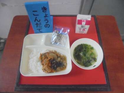 今日の献立は、マーボーあつあげ丼、中華スープ、ミニフィッシュ、牛乳です。