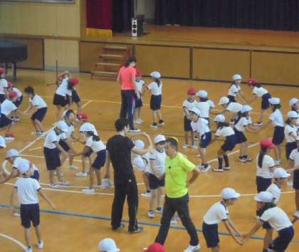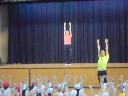 東京から、NHKラジオ・テレビ体操の講師 多胡 肇(たご はじめ)先生とアシスタントの矢作 あかり(やはぎ あかり)先生がお越しくださり、子どもたちに正しいラジオ体操を教えくださいました。