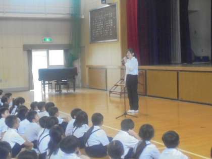 (上)今日から教育実習に来られた井上 千華子先生を紹介しました。もと塩草小学校の卒業生の方です。1か月間、一緒にがんばりましょう!
