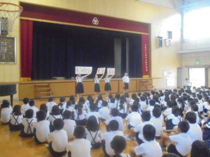 (下)明日からあいさつ週間が始まります。児童会の皆さんが「相手の目を見て 元気に 笑顔で」のスローガンを発表してくれました。