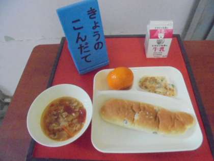 今日の献立は、豆乳マカロニグラタン(米粉)、トマトスープ、みかん(冷凍)、パン、牛乳です。