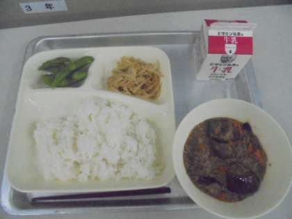 今日の献立は、マーボーなす、もやしのごま酢あえ、えだまめ、ごはん、牛乳です。