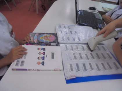(下)本の貸し出しをしています。