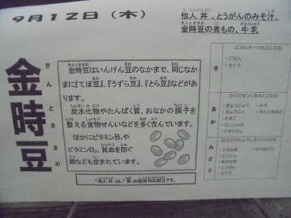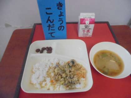 今日の献立は、今日の献立は、他人丼、とうがんのみそ汁、金時豆の煮もの、ごはん、牛乳です。
