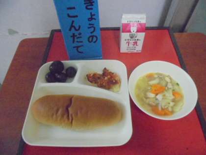 今日の献立は、鶏肉とてぼ豆のスープ煮、じゃがいもとトマトのチーズ焼き、ぶどう(巨峰)、パン、牛乳です。