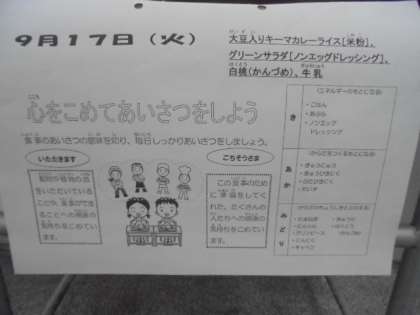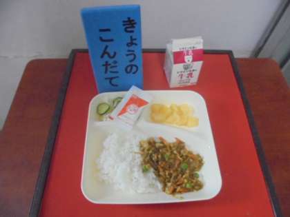 今日の献立は、大豆入りキーマカレーライス(米粉)、グリーンサラダ(ノンエッグドレッシング)、白桃(カット缶)、ごはん、牛乳です。