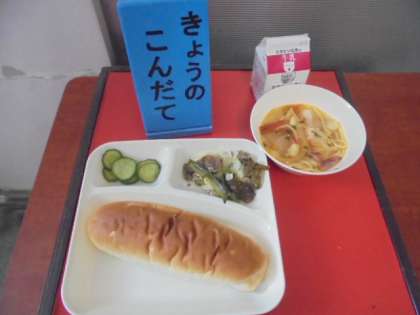 今日の献立は、牛肉のカレー風味焼き、トマトのスープスパゲッティ、きゅうりのピクルス、パン、牛乳です。