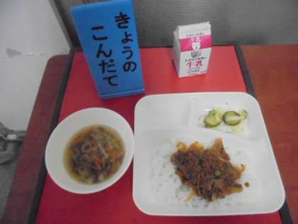今日の献立は、もずくと白ねぎのスープ、キャベツときゅうりのサラダ、タコライス(ごはん)、牛乳です。