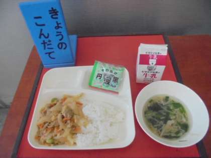 今日の献立は、中華スープ、ソフト黒豆、ピリ辛丼(ごはん)、牛乳です。