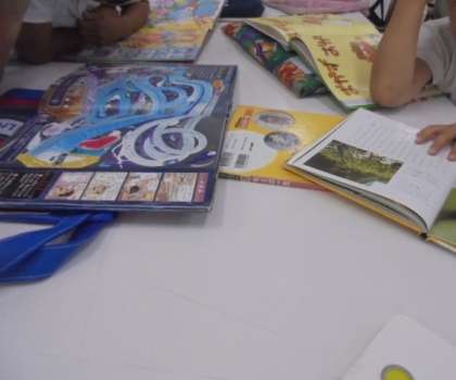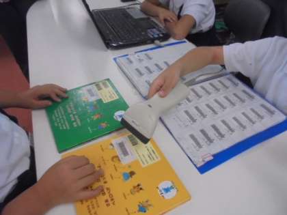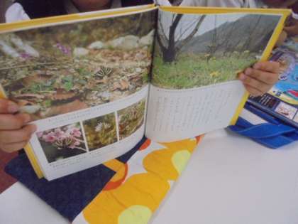 1組と2組が一緒に図書室で本を読んでいます。