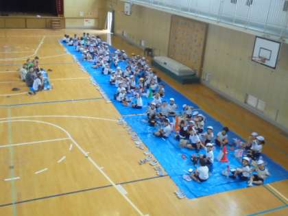 体育館でお弁当を食べています。