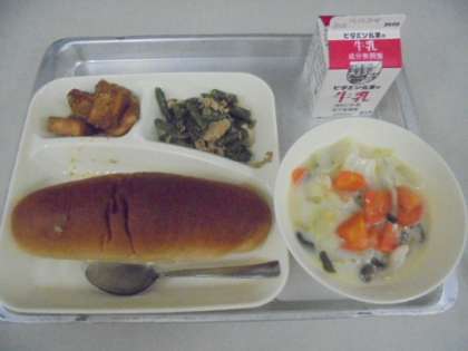 今日の献立は、はくさいのクリーム煮、あつあげのごまじょうゆかけ、豚肉とさんどまめのオイスターソースいため、パン、牛乳です。