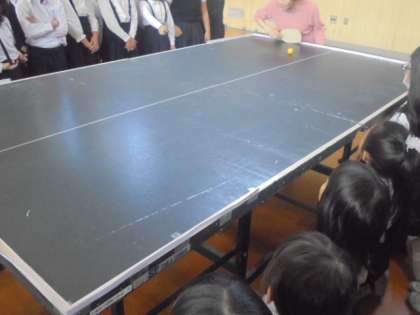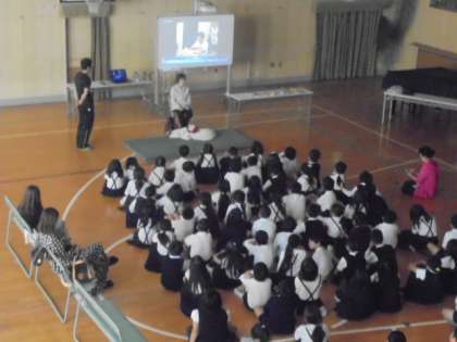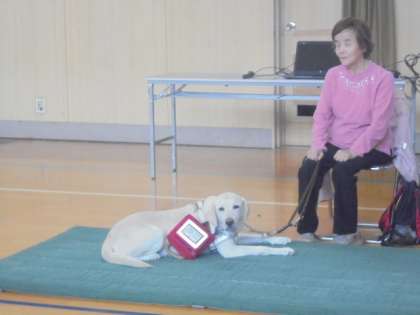 盲導犬ユーザーの山本美惠子さんとフェリシアちゃんをお招きしました。山本さん自身のDVD(水泳や卓球、料理など)を見たり、便利なグッズを紹介していただいたりしました。また、盲導犬の働きを教えていただいたり、フェリシアちゃんにさわらせていただきました。