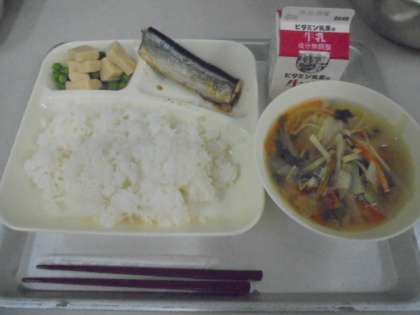 今日の献立は、さんまのさんしょう焼き、すまし汁、高野どうふの煮もの、ごはん、牛乳です。