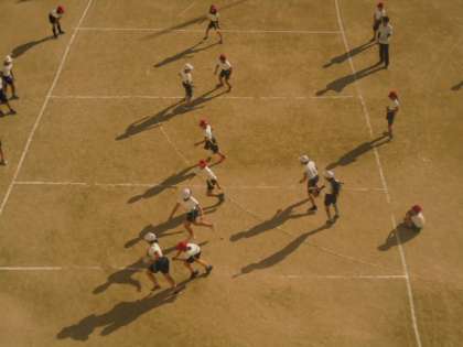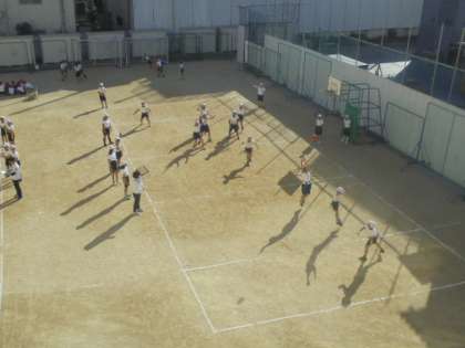 体育のボール運動「フラッグフットボール」です。タックルをしないアメリカンフットボールで、タックルの代わりに腰につけたフラッグをとります。作戦会議は、真剣そのものです。