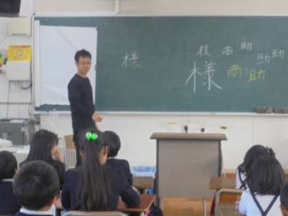 (下)書き順に注意する漢字を教えています。様、商、助。