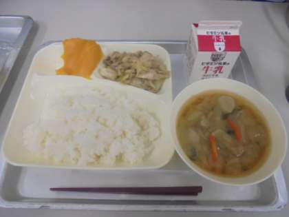 今日の給食は、豚肉とまいたけのいためもの、つみれ汁、かぼちゃういろう、ごはん、牛乳です。