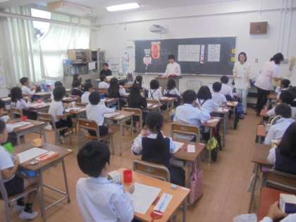 (上)歯みがき教室をしていただきました。歯科衛生士の先生方、歯科校医の太田先生、お忙しいところありがとうございました。