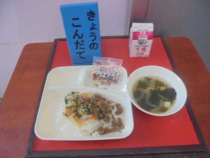 今日の給食は、ビビンバ、わかめスープ、アーモンドフィッシュ、ごはん、牛乳です。
