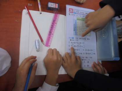 (上)九九の計算を教え合っています。